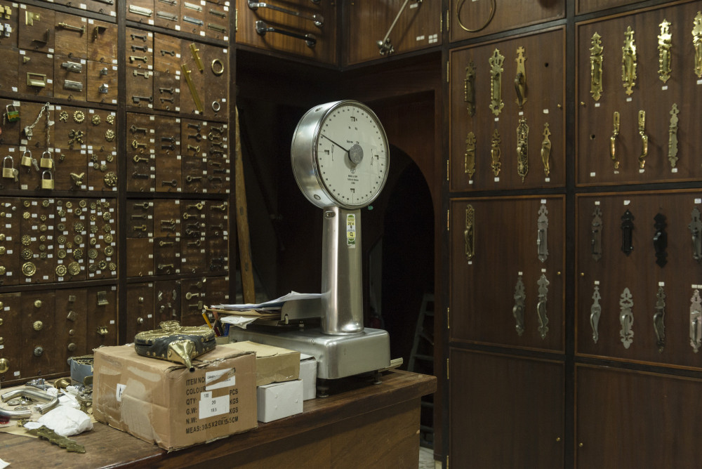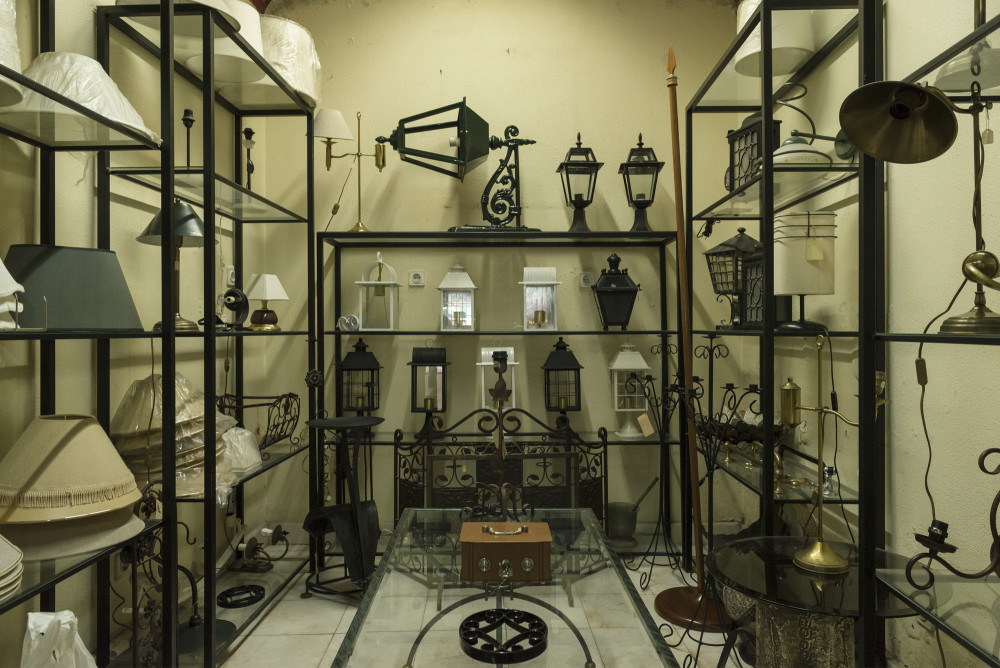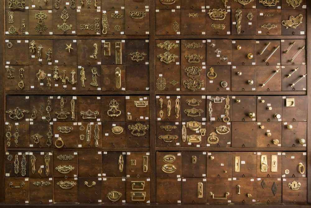 À entrada, o letreiro em tubo de ferro sobre a porta e a marca empedrada na calçada à portuguesa, dá entrada a um espaço amplo, rodeado por gavetas de madeira com as peças expostas no exterior, uma constelação de tons de metal que contrasta com a madeira escura. As peças todas versam com qualquer coisa que possa precisar para completar um móvel ou abrir e fechar uma porta, janela, ou cofre. São sobretudo ferragens em latão fundido, chaves e fechaduras, puxadores e batentes de portas, números, argolas e aldrabas, dobradiças, terminais de varão e cortinados, cabides e por aí fora. Também executam alguns modelos por encomenda e fazem cromagens e outro tipo de oxidações. Tudo o que está à vista está à venda, apesar do carácter muitas vezes raro, de certas peças que já não encontra noutro lado. Nos bastidores da loja o espólio continua, disposto num pequeno labirinto que pede ao olhar que se demore. Não é óbvio onde se possa encontrar pequenos tesouros, como o puxador desenhado pelo cenógrafo, figurinista e decorador francês que viveu quase toda a sua vida em Portugal, Lucien Donnat.