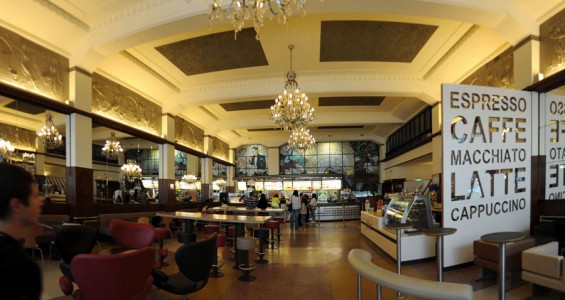 Localizado no que já foi o Café Imperial nos anos 40, apresenta uma decoração em estilo art deco – frisos em relevo, vitrais coloridos, lustres pomposos. Em contraste, as mesas e bancos são modernas e coloridas. No rés-chão bem iluminado fica o balcão e o café, e no subsolo há mais lugares.